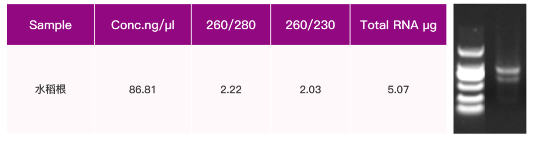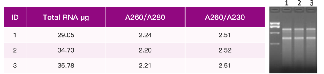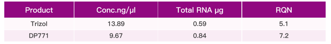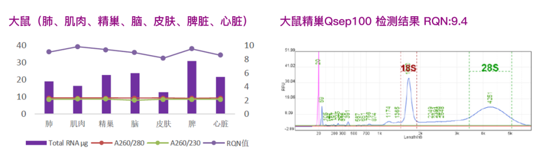 取适量大鼠的各类组织(60 mg),使用TIANGEN 磁珠法高效组织/细胞总RNA 提取试剂盒(DP771),整合自动化核酸提取仪提取总RNA,60μL 洗脱。RNA 浓度通过TGem Ultra 全波长分光光度计测定,RQN 值通过Qsep100 测定(完整结果见下方《磁珠法高效RNA提取样本库》)。