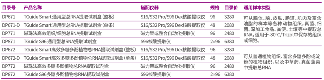 TIANGEN高效磁珠法RNA提取试剂盒,采用全新升级磁珠和裂解漂洗体系,获得的RNA得率更高,纯度和完整性更好,RIN值表现明显优于传统方法。不止适用于普通样本,对于粘稠的、油脂含量高、腐殖酸含量高等成分复杂的样本成功率更高