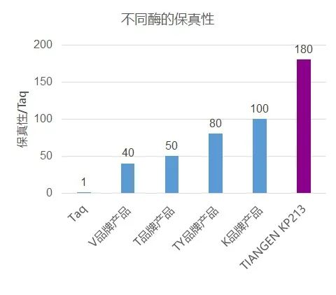 采用 KP213 和市场主流产品扩增 4kb DNA 片段(35 个循环),产物用 TIANGEN PCR-free 建库试剂盒进行建库,illumina 平台测 1G 数据量,后续根据各产品扩增碱基突变率得出产品的保真性。TIANGEN KP213 保真性可达 Taq 酶的 180 倍
