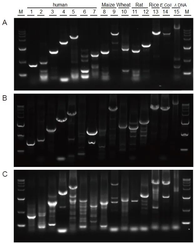 A: TIANGEN KP213; B: TY 公司高保真酶;C: K  公司高保真酶。模板上样量: 基因组 DNA, 200 ng; Lamda DNA, 50 ng。