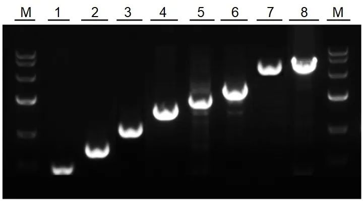 M: TIANGEN D15000 Marker。1: 0.75 kb; 2: 1 kb; 3: 2 kb; 4: 3.9 kb; 5: 6 kb; 6: 0.48 kb (GC 75%); 7: 1.5 kb (GC 71%); 8: 2 kb; 9: 8.2 kb; 10: 2.3 kb; 11: 2 kb; 12: 3 kb; 13: 8.2 kb; 14: 8.1 kb; 15: 15 kb。