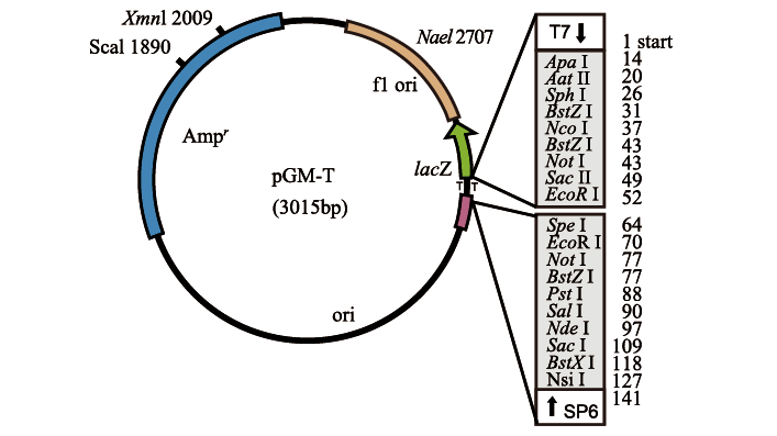 pGM-T是高效克隆 PCR 产物的专用载体,由克隆载体改建而成,使多克隆位点两侧的 3’端带 T。由于大部分耐热聚合酶反应时都会在 PCR产物的 3’端添加一个 A,可与 pGM-T 载体 3’的T互补连接,同时 3’T突出端可以防止载体的自身环化,因此可大大提高PCR产物的连接和克隆效率。pGM-T载体包含有T7和SP6 RNA聚合酶启动子,其侧端和多克隆位点区相接,多克隆位点区位于β半乳糖苷酶的α肽编码区内。α肽插入失活使得菌落在指示培养基中呈现不同颜色,可根据颜色直接筛选重组克隆,白色克隆为阳性重组克隆,蓝色的为载体自连的克隆 (具体筛选原理见分子克隆第三版)。