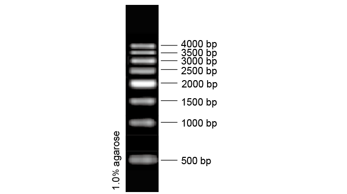 500 bp DNA Ladder 是由单独制备的PCR 产物混合而成,共有8 DNA 片段,已加入上样缓冲液,可直接电泳,每次上样 6 µl,为便于电泳后观察, 2000 bp 条带最亮,每次用量约为 100 ng,其它条带的 DNA 每次用量约为 50 ng