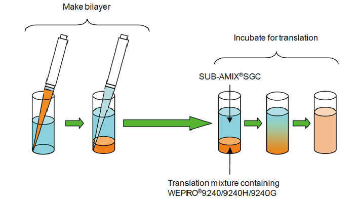 本系列试剂盒能够通过线性模板或质粒模板实现蛋白的中量表达。本系列试剂盒采用转录和翻译非偶联的方法,试剂盒中提供包含体外转录所需的酶、NTP 和离子环境的 Transcription PreMix LM,加入模板后先完成 DNA 的转录,再配合麦胚无细胞蛋白表达系统预混 mix 完成 mRNA 的翻译,该 mix 中包含蛋白翻译的所有必需酶类、各种 tRNA 和离子,从而获取目的蛋白。本系列试剂盒利用双层液相反应法(Bilayer)表达目的蛋白,每个反应蛋白表达量为 30 µg 左右,适合 Western Blot、CBB 染色等蛋白检测实验和蛋白结构解析以及免疫共沉淀等常见蛋白质功能解析。此外,本系列中的 H16 和 G16 试剂盒专门为表达 His 标签蛋白和GST 标签蛋白做特殊优化,使得纯化后的蛋白纯度更高。